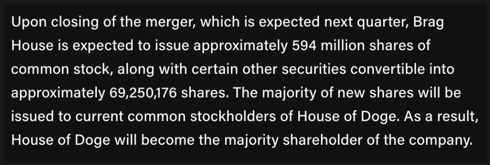 합병은 내년 1분기 내 마무리될 예정이며, 브래그 하우스는 약 5억 9,400만 주의 보통주를 새로 발행할 계획입니다. 이 중 대부분은 하우스 오브 도지 주주들에게 돌아가며, 결과적으로 하우스 오브 도지가 최대 주주로 자리하게 됩니다.