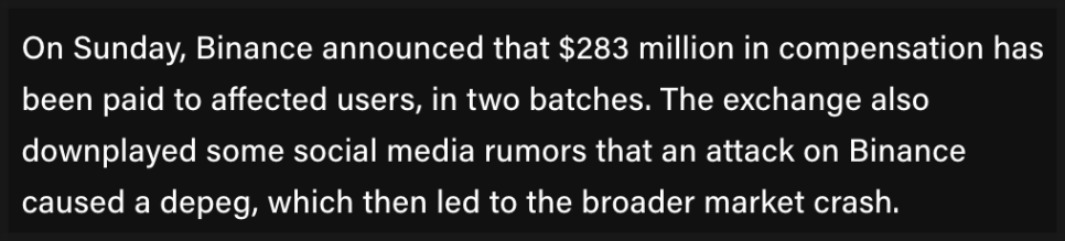 이와 별개로 바이낸스는 피해를 입은 사용자들에게 약 2억 8,300만 달러를 보상했습니다. 마진, 선물, 대출 상품에서 해당 자산을 담보로 사용하던 고객들과 Earn 상품 이용자들이 대상이었습니다. 회사는 이 보상금을 두 차례에 걸쳐 지급했으며, 추가 보상 건도 검토 중이라고 밝혔습니다.