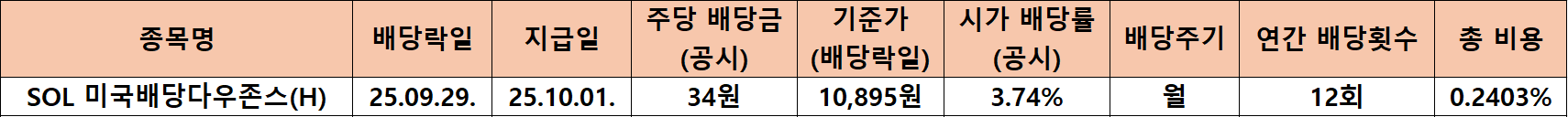 ‘SOL 미국배당다우존스(H)’는 국내 상장된 월배당 ETF로 미국 다우존스 배당지수를 추종하면서 환헤지를 병행하고 있습니다.