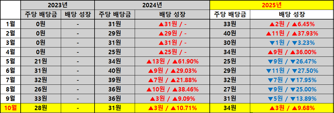 올해 10월 기준 주당 배당금은 34원으로 공시되었고 시가배당률은 3.74% 수준을 기록했습니다. 지난해 같은 달 배당금이 31원이었던 점을 감안하면 약 9.68%의 증가율을 보였습니다. 2024년의 성장률이 약 10.7%였던 것을 고려하면 이번에도 유사한 수준의 배당 확장을 이어가고 있는 셈입니다.