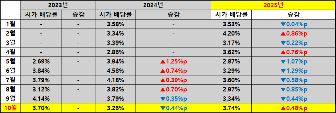 주가 하락에도 불구하고 배당금이 상승했기 때문에 시가배당률은 전년 3.26%에서 올해 3.74%로 0.48%포인트 상승했습니다. 즉, ‘배당금은 늘고 주가는 조정된’ 구간이었기에 현재 시점에서는 배당수익률 측면의 매력이 오히려 강화된 상황입니다.