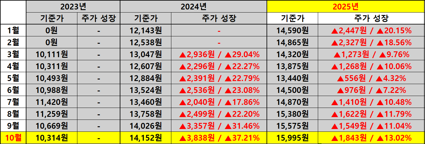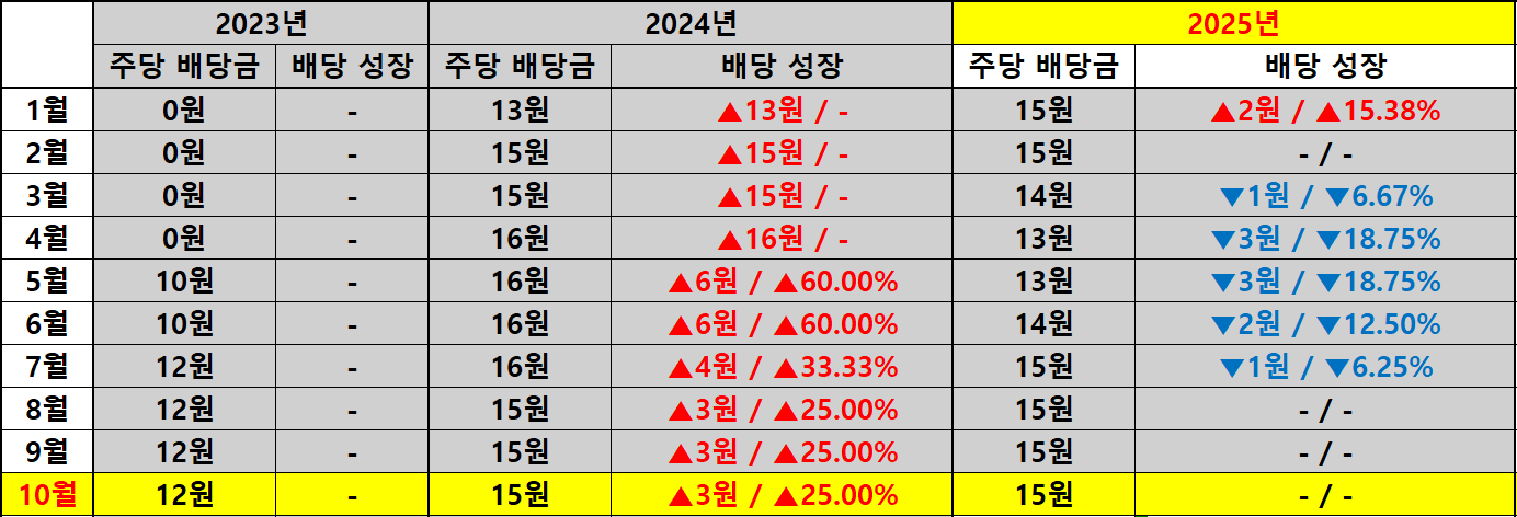 2023년에는 5월부터 월 배당이 시작되어 10월까지 꾸준히 상승세를 이어갔으며 2024년에는 전반적으로 25~60% 수준의 성장률을 보여주었습니다. 2025년 들어서는 일부 구간에서 배당금이 다소 조정되었지만 10월 기준 배당금이 15원으로 유지된 점은 배당 정책의 일관성을 보여주는 대목입니다. 결국 배당금의 절대치는 유지되면서도 변동성이 줄어든 만큼 단기 성장보다는 안정성에 무게를 둔 것으로 해석됩니다.