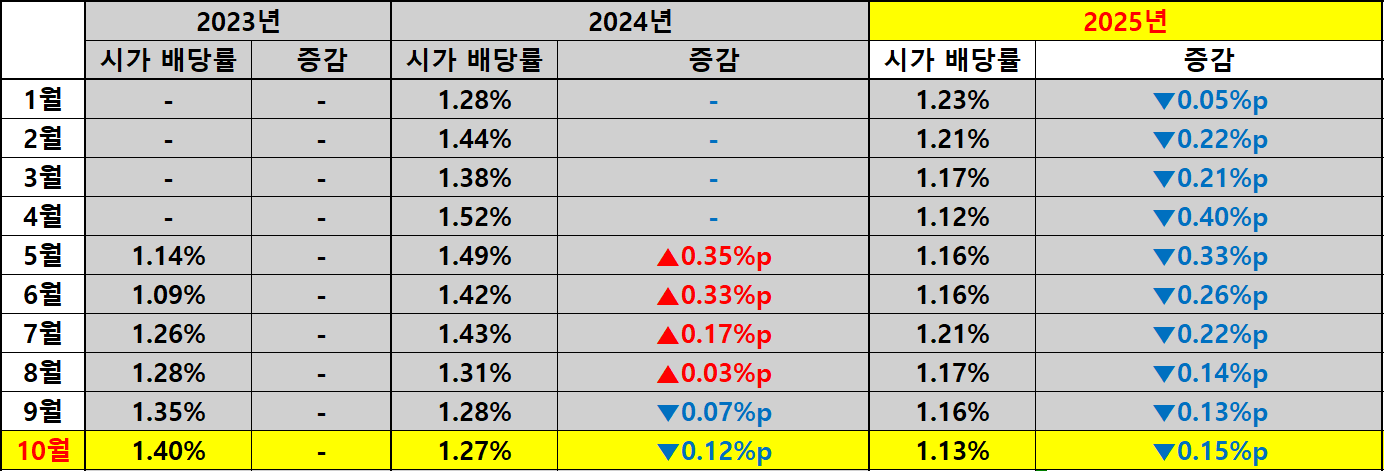 배당금이 동일하게 유지되었음에도 불구하고 시가배당률은 하락세를 보였습니다. 공시 기준 시가배당률은 1.13%로 전년 1.27% 대비 0.15%p 낮아졌습니다. 이 수치는 배당금의 정체보다는 주가 상승의 영향으로 해석할 수 있습니다.