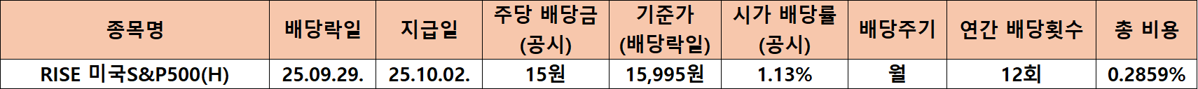 특히 2025년 전체 기준으로 보면 1월부터 9월까지 주가가 꾸준히 상승하면서 평균 상승률이 약 10% 이상을 유지했습니다. 이런 꾸준한 우상향 흐름 속에서 배당률이 낮아진 것은 배당금 축소가 아니라 ‘자산가격 상승에 따른 자연스러운 희석 효과’로 이해하는 것이 적절합니다. 결국 RISE 미국S&P500(H)는 ‘배당 안정성’과 ‘자본 성장성’이 균형을 이루는 포트폴리오 구조를 보이고 있습니다.
