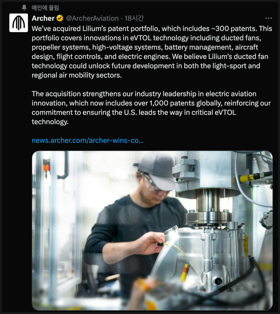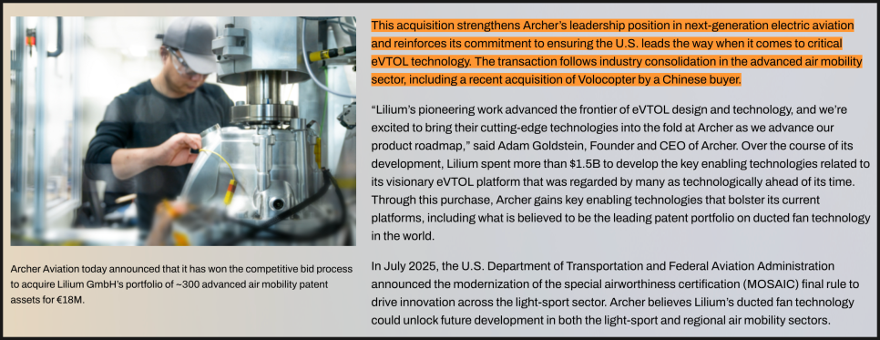 그리고 아처는 이번 인수를 두고 공식 발표에서 “이번 인수가 미국의 차세대 eVTOL 기술 리더십을 강화할 것”이라고 강조했는데요. 산업적 맥락에서도 의미가 큽니다. 얼마 전 Volocopter라는 기업이 중국 기업에 인수되면서, 서방권에서는 기술 주도권을 지키려는 움직임이 강화되고 있는 상황입니다. 아처가 릴리움의 핵심 특허를 인수한 건 미국이 eVTOL 산업의 기술 표준과 방향을 주도할 수 있는 기반을 강화한 사건으로도 해석할 수 있습니다.