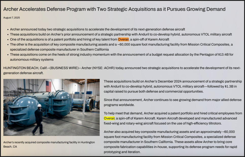 최근 Overair라는 기업 역시 자금난을 겪은 뒤 일부 설비와 인력을 아처가 인수했습니다. 아처는 올해 8월에도 오버에어의 제조시설과 관련 자산을 확보하며 몸집을 키운 상태입니다.