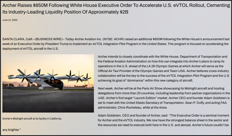 eVTOL 업계에서 커진 아처의 위상