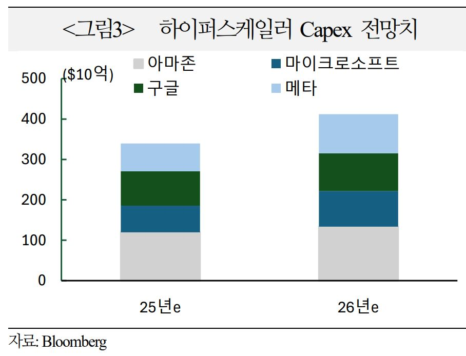 - 26년 capex는 아마존 +12%, 마이크로소프트 +34%, 구글 +10%, 메타 +40% 증가 전망. 26년 전망치 자체도 6월말 대비 약 24% 상향 조정