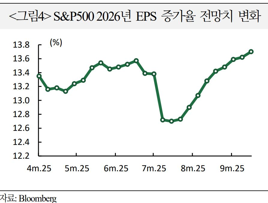 ● 26년 EPS 증가율 전망치는 5월말 13.4%에서 관세 우려 등으로 12%까지 하락 후 8월초부터 지속 개선되며 최근에는 13.7%로 상향
