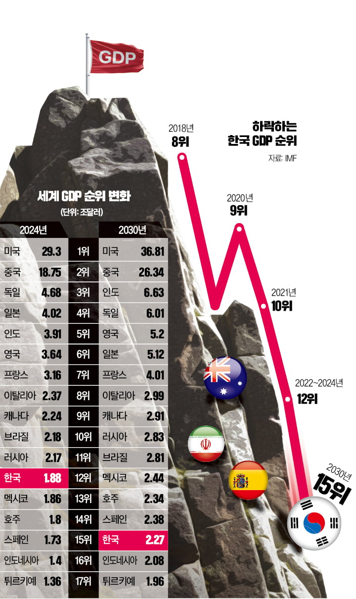 지난해 세계 12위인 한국의 국내총생산(GDP) 순위가 2030년 15위로 떨어질 것이라고 국제통화기금(IMF)이 전망