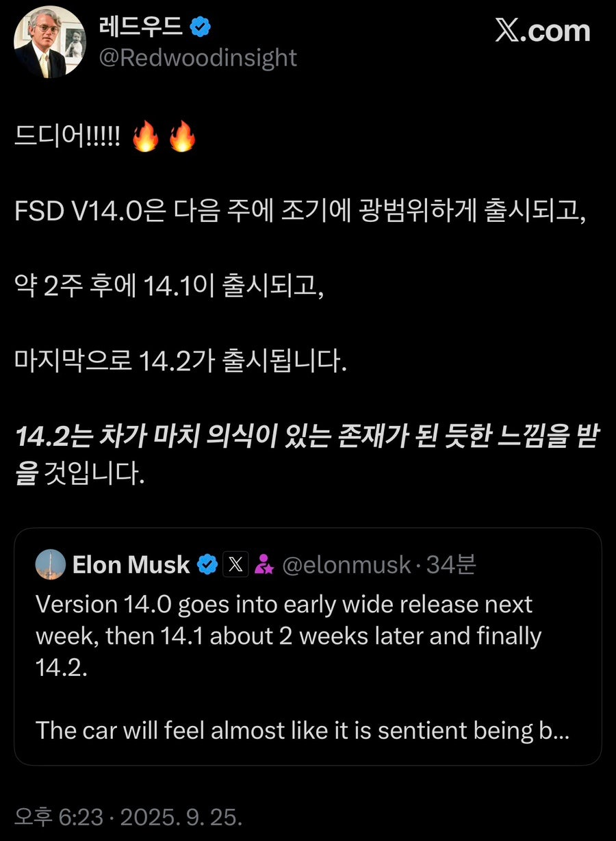 일론 머스크는 돌아오는 주에 FSD V14를 광범위하게 출시하고, 2주 뒤에 V14.1, 그리고 V14.2에서는 최종적으로 ‘마치 의식이 있는 듯한’ 버전으로 업그레이드 됩니다.