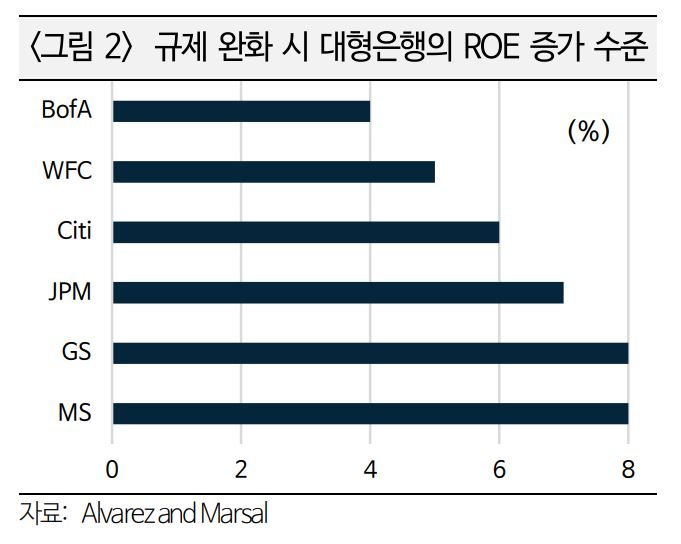 - 미국 은행산업의 CET1 비율 요건이 14% 가량 완화될 경우, 주당순이익EPS은 약 35% 증가하고 유형자산 보통주자본이익률 ROATCE은 6% 상승할 전망