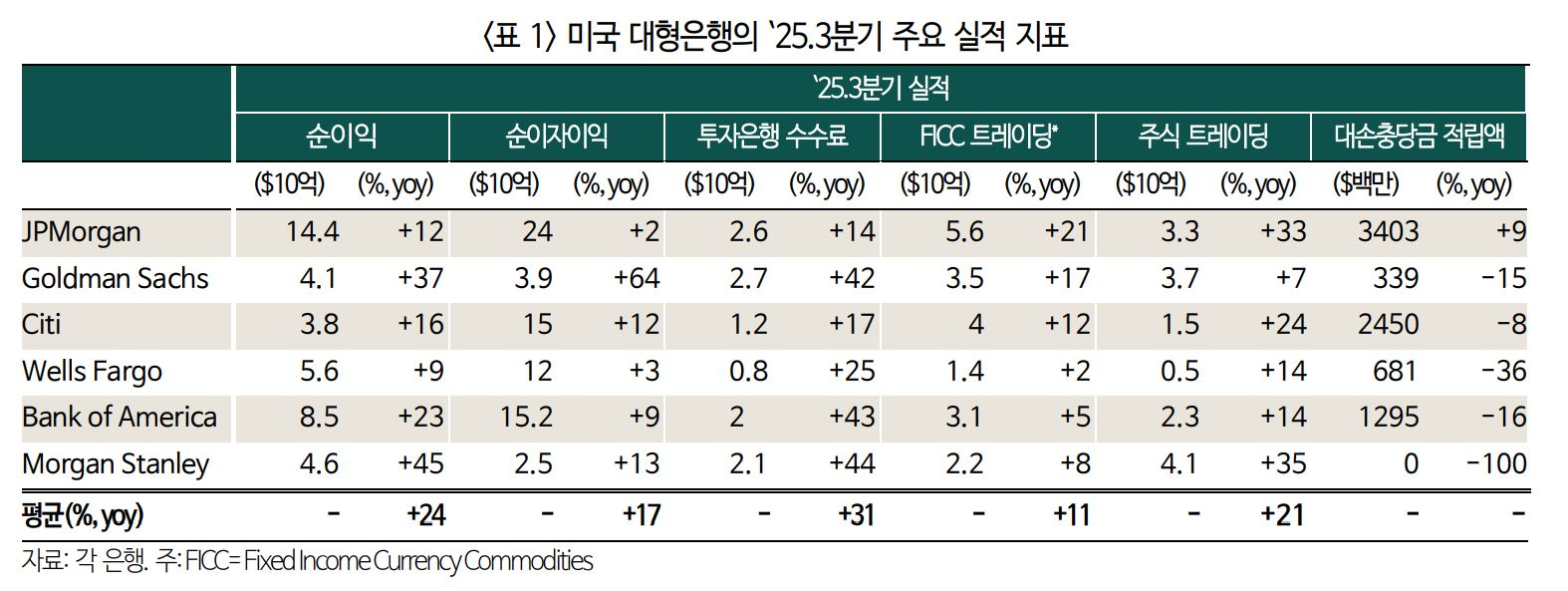 `25.3분기 미국 6대 은행들의 순이익(평균 +24%, yoy)은 순이자이익과 IB 수수료 수입 호조로 시장 예상(+5.4%)을 큰 폭 상회