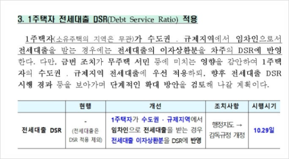 신용대출이나 전세대출도 역시 강화되는데 1주택자 전세대출 2억원 제한 된다. 전세대출 보유 차주의 규제지역 내 3억 초과 아파트를 취득의 경우 전세대출도 제한된다. 그리고 이미 소유권 이전 조건부 전세대출로 잔금을 치르는 것도 금지되어 갭투자를 방지한다. 전세대출 또한 규제지역 내에선 이자상환분이 DSR이 적용되어 대출받는 것이 매우 어려워진다. 마지막으로 신용대출 1억원 있는 사람은 규제지역 내 주택 매수도 불가능하다.