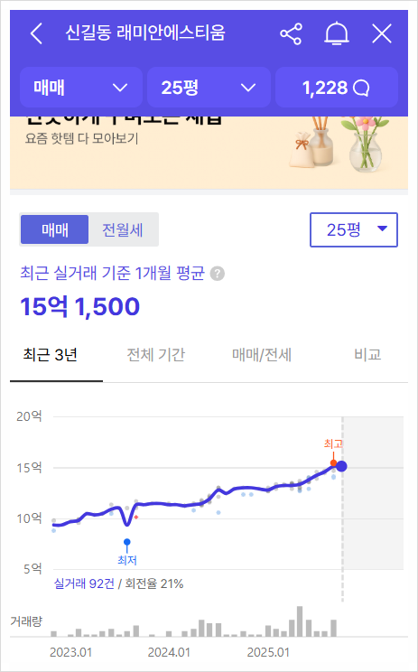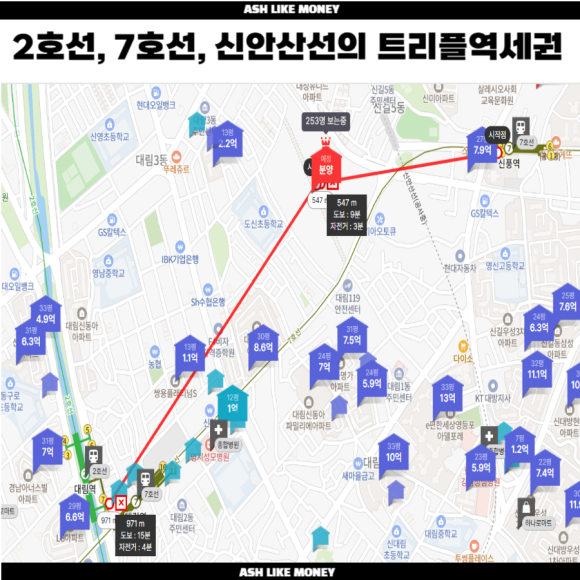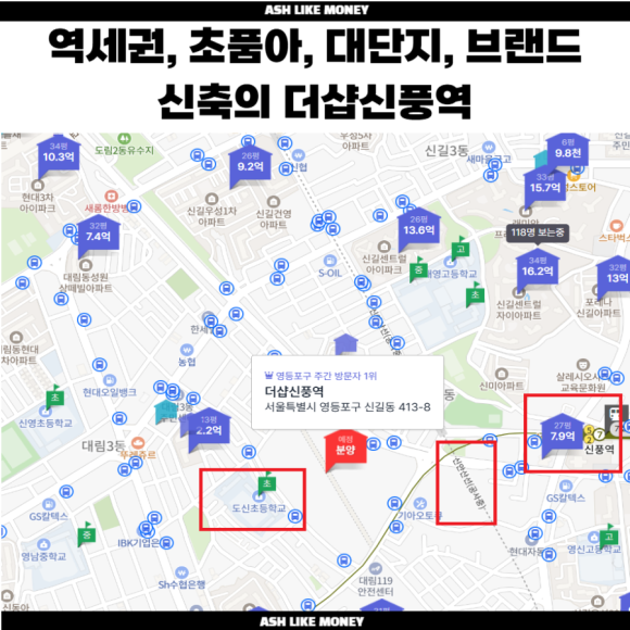 신풍역더샵은 2천세대 이상이지만 지역주택조합으로 탄생하고 조합원들 제외하고 300세대 정도 분양한다. 규모는 지하 3층~지상 35층이며 29년 입주예정이고 분양가 상승 이슈로 원래 분양일정인 25년 5월에서 뒤로 미루어졌다. 래미안 에스티움이 대장아파트이며 25평이 15억 이상, 34평이 17억 이상이다. 해당 아파트는 7호선 + 2호선 + 신안산선의 트리플역세권이며 대단지에 신축, 초품아이다. 하지만 아쉬운 건 신길뉴타운과 거리가 떨어져 있어 나홀로 대단지이며 다세대주택 및 상가주택들로 어수선하며 대림동이 근처라는 것이다.