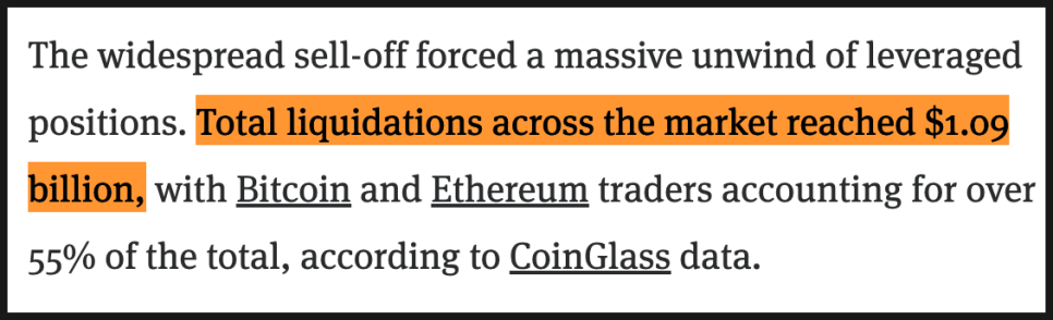 공포가 확산되자 시장에서는 24시간 동안 10억 9천만 달러 규모의 대규모 강제 청산이 또 한 번 발생했습니다. 레버리지는 빌린 자금으로 투자 규모를 키우는 방식인데, 가격이 하락할 경우 손실이 확대되고 강제 청산이 이어집니다. 이런 청산이 연쇄적으로 발생하면서 낙폭이 더욱 커졌습니다.
