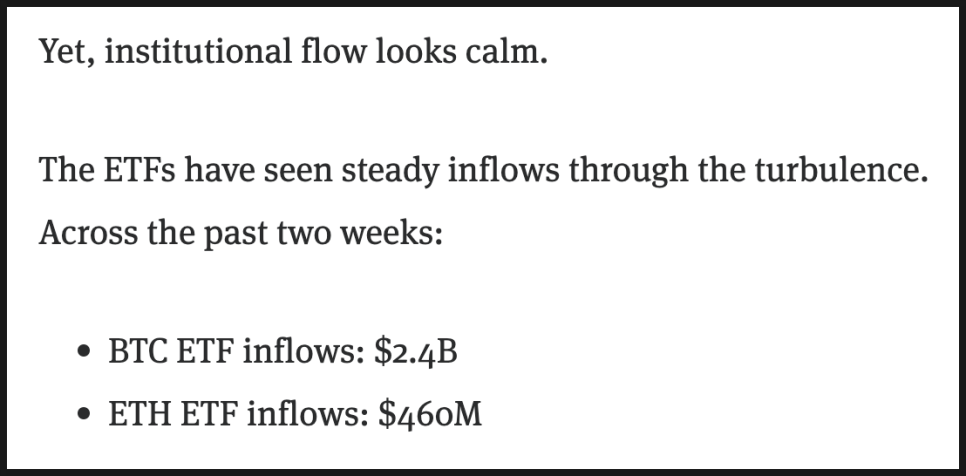 이는 기관 투자자들이 이번 하락을 패닉 상황으로 받아들이지 않고 있다는 뜻입니다. 실제로 지난 2주 동안 비트코인 ETF에는 약 24억 달러, 이더리움 ETF에는 약 4억 6천만 달러가 순유입됐습니다. 시장의 핵심 자금이 흔들리지 않고 있다는 점은 중요한 신호입니다.