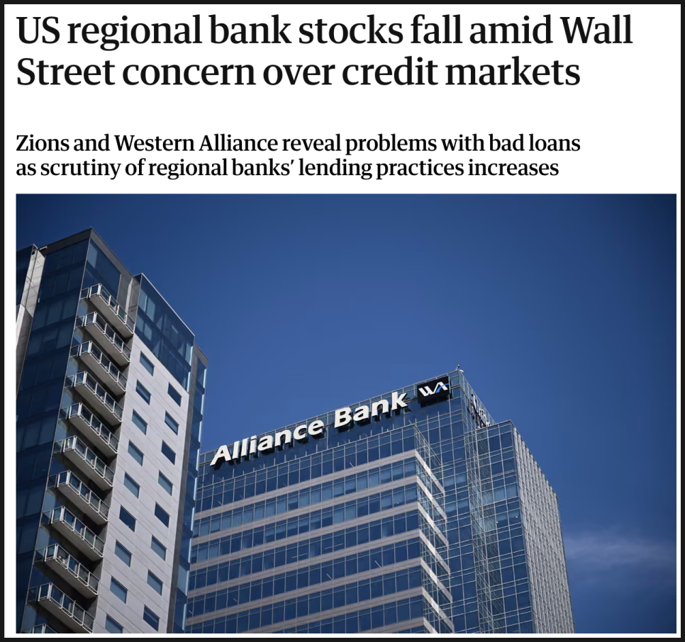 미국의 지역 은행인 자이언스 뱅코퍼레이션(Zions Bancorporation)과 웨스턴 얼라이언스 뱅코퍼레이션(Western Alliance Bancorporation)에서 대출 포트폴리오 관련 불안이 제기되면서 투자자들이 위험 자산에서 자금을 빼기 시작했습니다. 이를 ‘안전자산으로의 이동(flight to safety)’이라고 부르는데요. 위험 자산을 팔고 현금이나 국채처럼 안정적인 자산으로 옮기는 현상을 뜻합니다.