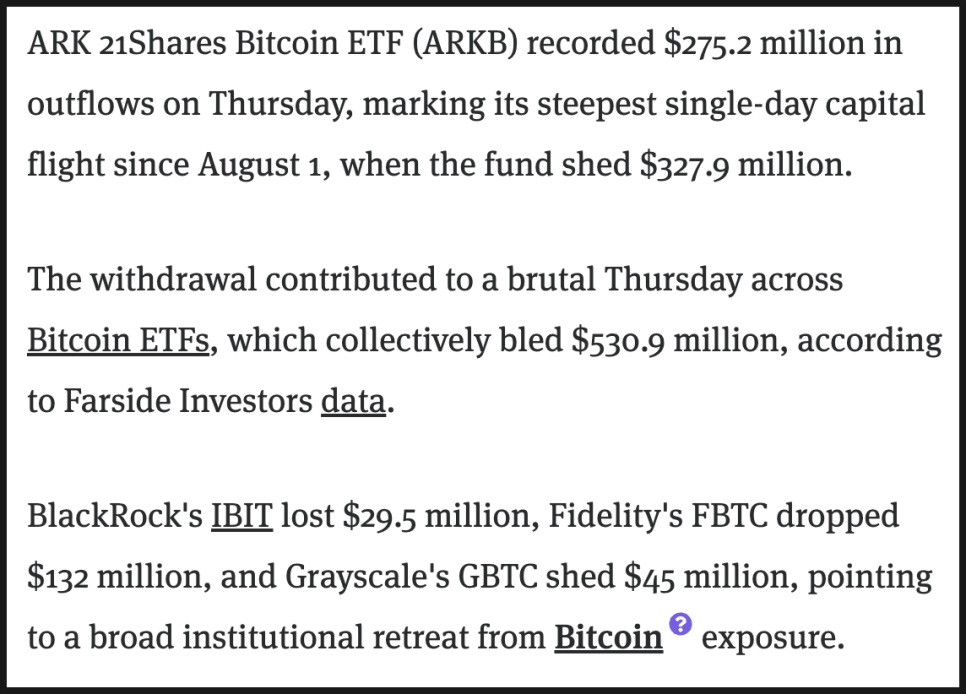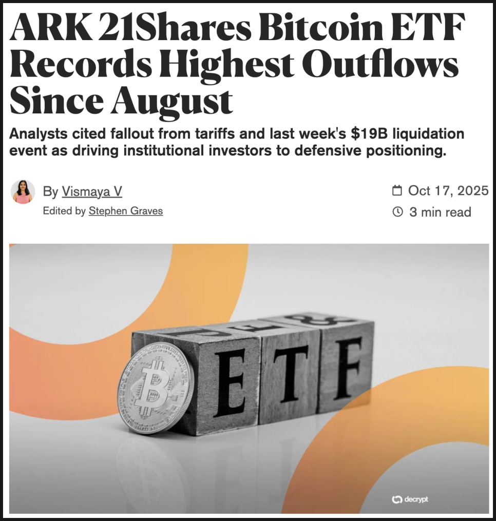다만 모든 ETF가 같은 흐름을 보인 것은 아닙니다. 아크 21셰어스(ARK 21Shares)의 비트코인 ETF에서는 10월 16일 하루 동안 2억 7,520만 달러가 빠져나갔습니다. 이는 8월 이후 최대 규모의 일간 유출입니다.