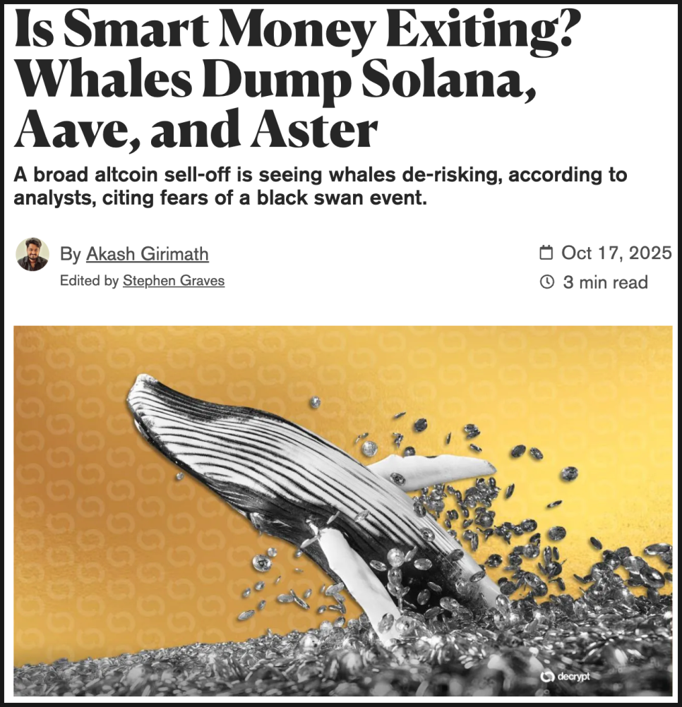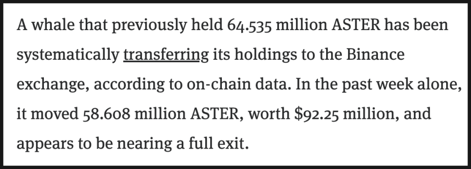 아스타(Aster) 코인 고래 역시 9,200만 달러어치를 옮기며 500만 달러의 손실을 감수했습니다. 이런 대규모 매도는 특히 변동성이 큰 알트코인 시장에서 충격을 키우는 요인입니다.