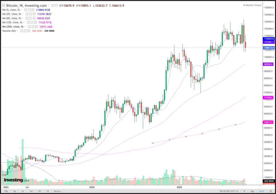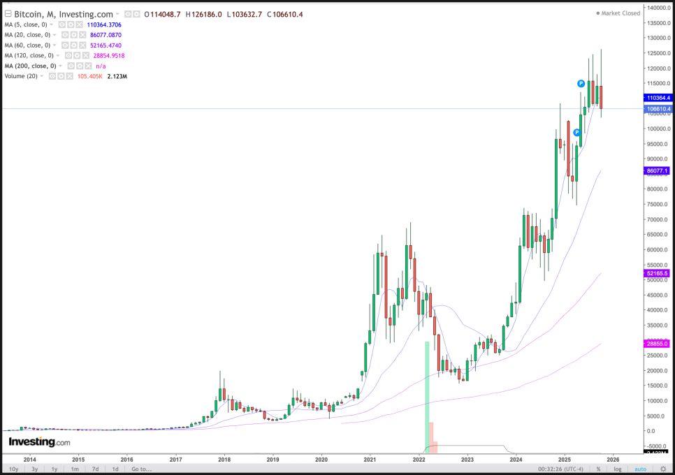 주간 차트를 보면, 비트코인은 2024년 중반부터 꾸준히 상승해 왔고, 2025년 중반에 정점을 찍은 뒤 조정을 받고 있는 모습입니다. 현재 가격은 20주 이동평균선 부근에서 움직이고 있는데, 이 선은 중기 추세의 핵심 기준선으로 자주 사용됩니다.