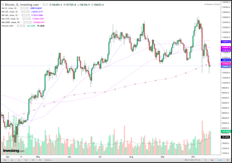 비트코인 일간 차트에서는 9월 말 고점 이후 빠르게 하락세가 이어지고 있는 모습이 뚜렷합니다. 단기 이동평균선(5일선과 20일선)이 급격히 꺾이면서 가격이 주요 지지선 아래로 내려온 상태입니다. 현재 캔들은 200일선 근처에서 지지를 테스트하고 있는데, 이 구간은 최근 몇 달 동안 중요한 지지 구간으로 작용해왔습니다.