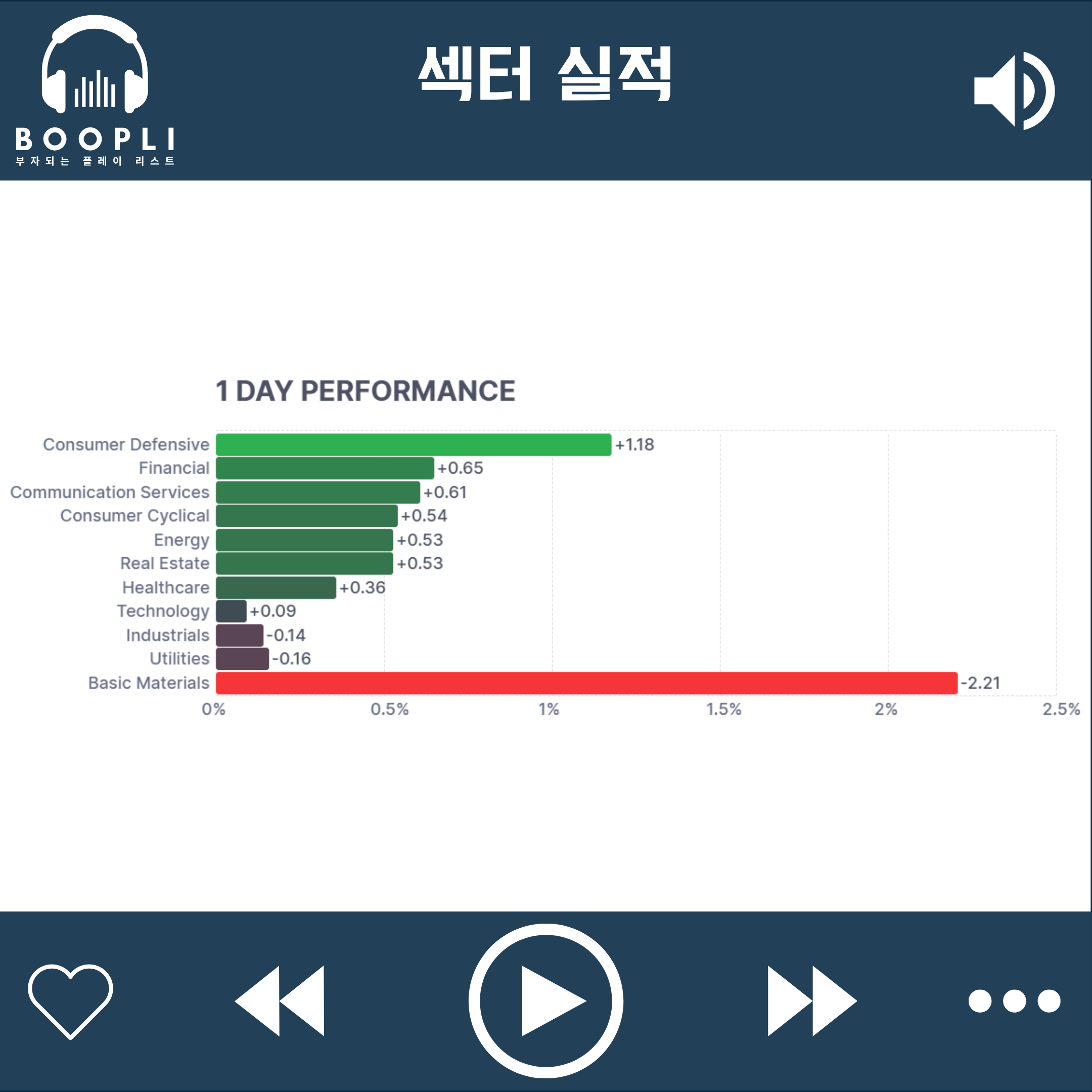 경기 방어주가 상승을 주도했으며, 이어서 금융, 커뮤니케이션 서비스, 소비 순환재, 에너지, 부동산 순으로 강세