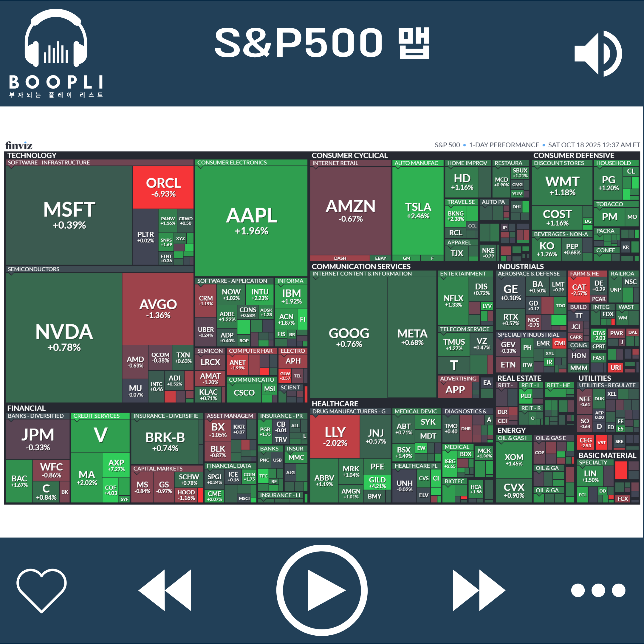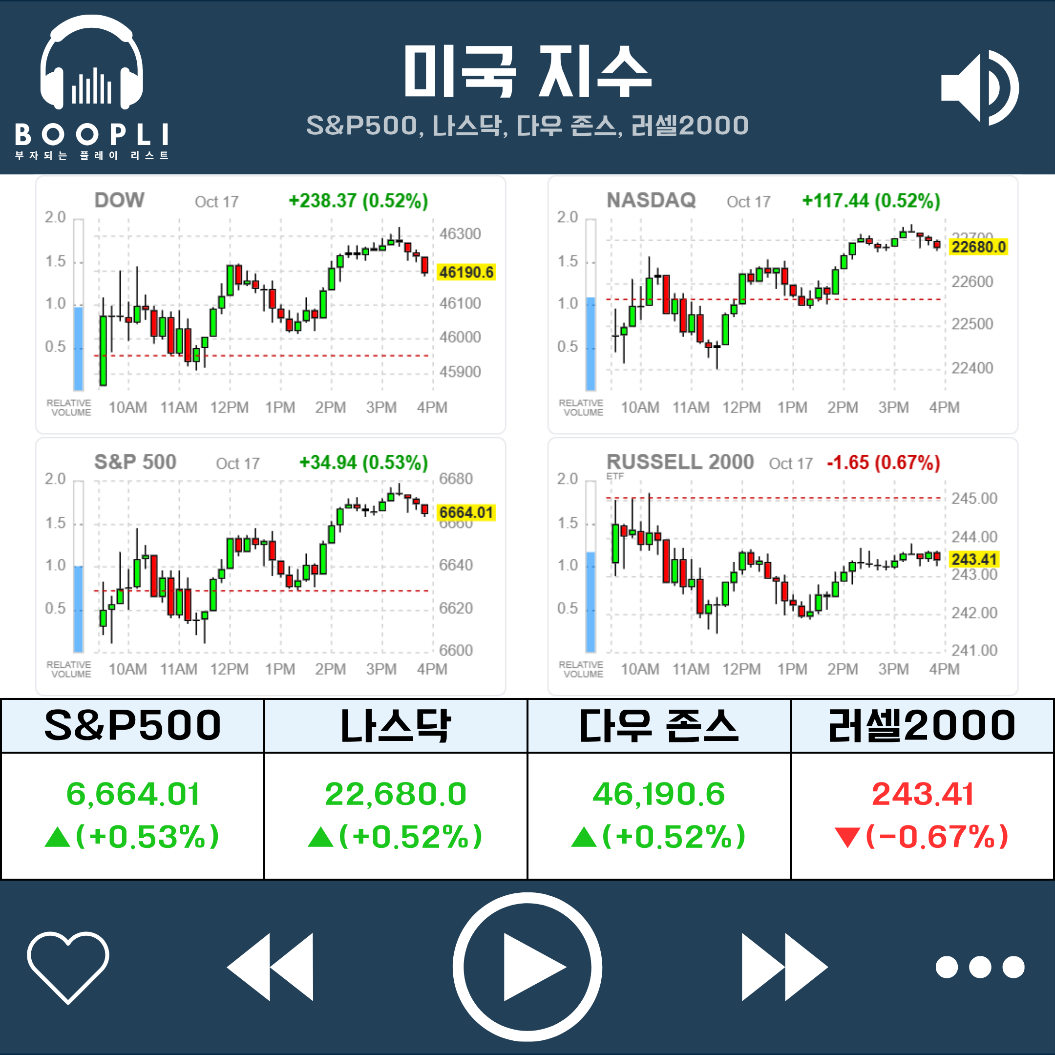 장 후반에는 역대 10월 만기 중 최대 규모인 3.4조 달러 옵션 만기일 영향으로 일부 차익 실현 매물이 출회되었으며, 3대 지수는 상승 흐름을 유지했으나, 러셀2000은 소폭 하락하며 장을 마침