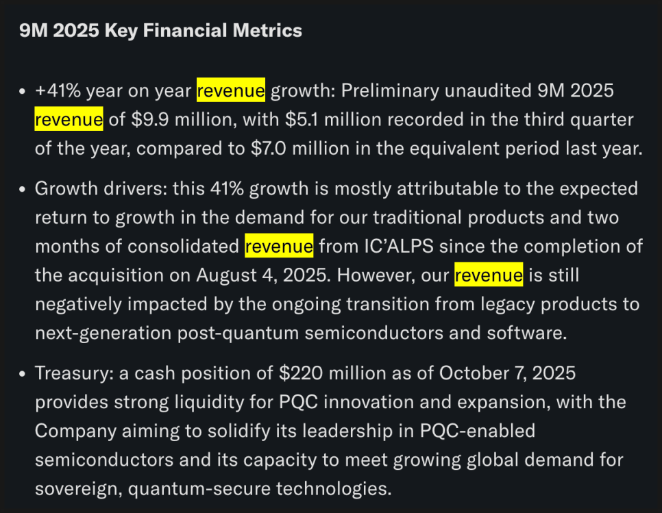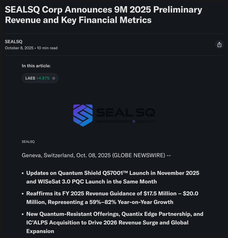 먼저 지난 2025년 10월 8일, SEALSQ는 2025년 1~9월 실적에 대한 예비 재무 결과와 함께 자사 핵심 사업의 진행 상황을 상세히 공개했습니다. 향후 몇 년간의 전략 방향을 명확히 보여준다는 점에서 특히 의미가 컸는데요.