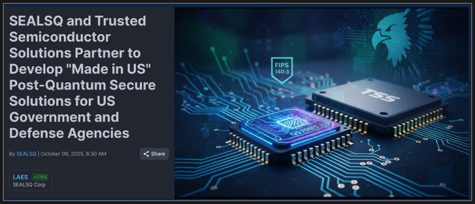 실스크(SEALSQ)는 미국 시장 공략에도 본격적으로 시동을 걸고 있습니다. 먼저 Trusted Semiconductor Solutions와 손잡고 ‘Made in USA’ 양자 보안 칩을 공동 개발한다고 밝혔습니다. 미국 방위산업과 정부 조달 시장에서는 국내 생산과 공급망 안정성이 매우 중요한 요소이기 때문에, 이 협업은 전략적 의미가 큽니다.