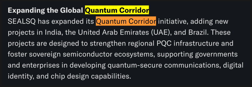 또한 국가 인프라 프로젝트에 본격적으로 진입했는데요. 실스크(SEALSQ)는 ‘Quantum Corridor’라는 이름으로 글로벌 사업 확장을 추진하고 있습니다. 스페인, 인도, 아랍에미리트(UAE), 브라질에서 새로운 PQC 인프라 프로젝트를 시작한다고 밝혔습니다.