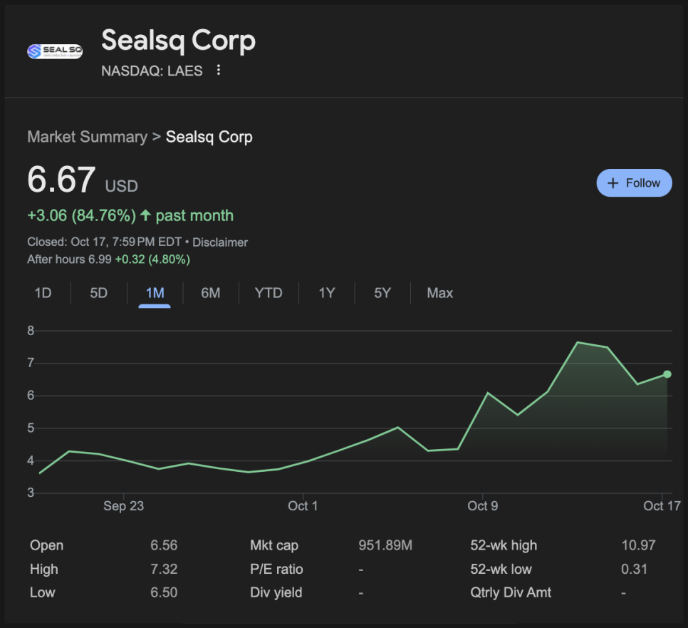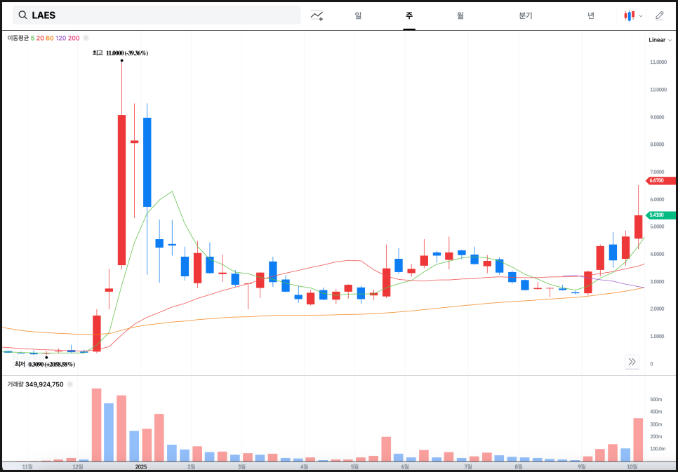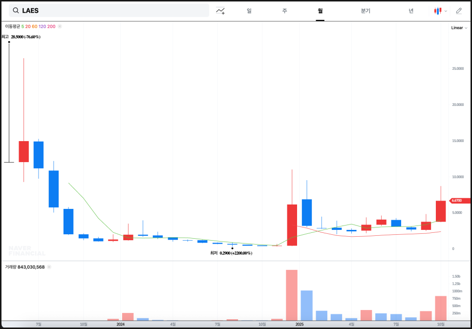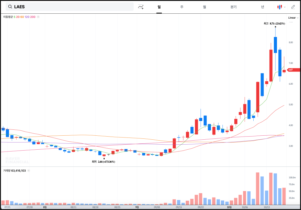 마지막으로 LAES 주식 주가 차트를 보겠습니다. 최근 일봉을 보면 9월 중순부터 거래량이 붙기 시작하면서 주가가 가파르게 상승했고, 단 4주 남짓한 기간 동안 저점 2.44달러에서 고점 8.71달러까지 치솟았습니다. 상승률로 보면 250%가 넘는 랠리입니다. 거래량도 뚜렷하게 늘면서 매수세가 집중적으로 몰렸던 게 보입니다.