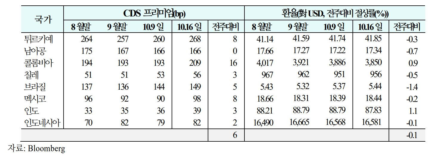 신용위험은 콜롬비아, 튀르키예 등을 중심으로 상승(주간 평균 등락폭:-2bp→ +2bp→ +6bp)