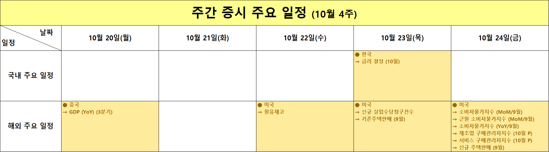 이번 주는 중국의 3분기 GDP를 시작으로 한국의 기준금리 결정, 미국의 9월 소비자물가지수(CPI)와 10월 제조업·서비스 PMI 예비치까지 연속적인 중요 지표가 예정되어 있습니다. 일정 순서상 글로벌 성장률과 인플레이션 흐름, 통화정책 기조가 하나의 흐름으로 연결되는 주간입니다.