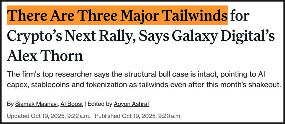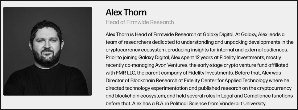 하지만 알렉스 손(Alex Thorn) 갤럭시 디지털(Galaxy Digital) 리서치 책임자는 전혀 다른 시각을 내놓고 있습니다. 갤럭시 디지털( Galaxy Digital )은 미국에 본사를 둔 디지털 자산 전문 금융회사로, 암호화폐 투자은행에 가까운 역할을 하는 곳입니다. 기관 투자자와 대기업을 대상으로 거래·자산운용·리서치·자문 서비스를 제공하며, 블록체인 및 암호화폐 관련 인프라 투자에도 적극적인 회사입니다.