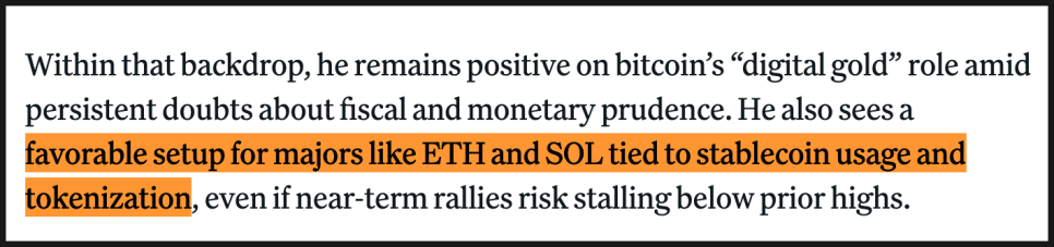 이러한 구조 속에서 알렉스 손은 특히 비트코인, 이더리움, 솔라나에 주목하고 있습니다. 비트코인은 여전히 ‘디지털 골드’라는 내러티브를 견고하게 유지하고 있습니다. 재정적자와 통화정책 불확실성이 이어지는 상황에서 비트코인은 안전자산 역할을 강화할 수 있다는 겁니다.