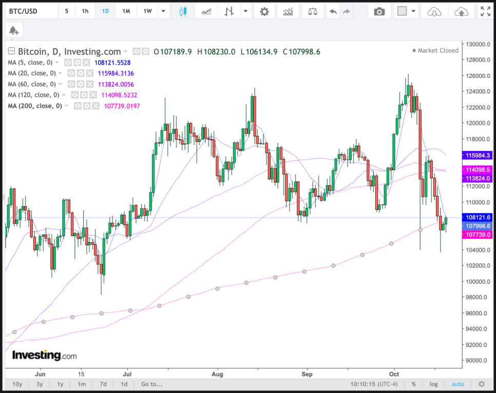 현재 일간 차트에서 비트코인 가격은 5일선 아래에 머물러 있고, 20일선과 60일선 역시 하락세로 기울어지며 단기 모멘텀이 위축된 상태임을 보여줍니다. 특히 최근 캔들의 형태를 보면 하락세 속에서 반등을 시도했지만, 상단에서 강한 저항을 받은 흔적이 뚜렷합니다. 단기적으로는 108,000달러 부근이 중요한 분기점으로 작용하고 있고, 107,000달러대에 위치한 200일선이 핵심 지지선 역할을 하고 있습니다. 이 구간이 무너지면 하방 압력이 더 강해질 수 있는 구조입니다.