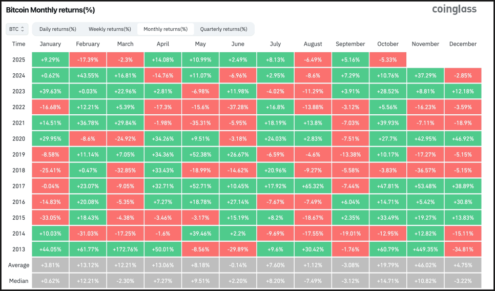10월은 전통적으로 비트코인에게 강세장으로 불려왔습니다. 커뮤니티에서는 이 시기를 ‘업토버(Uptober)’라고 부르며, 상승장을 기대하는 분위기가 자연스럽게 형성돼 왔죠. 실제로 과거 데이터를 보면 10월 평균 수익률은 약 19.8%에 달하고, 그다음 달인 11월은 평균 42%로 가장 강한 달로 기록돼 있습니다.