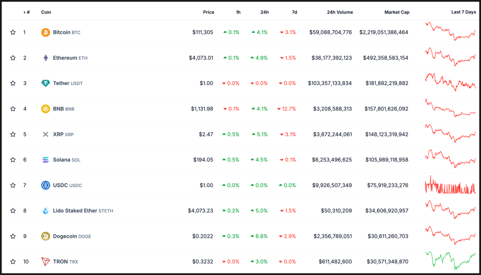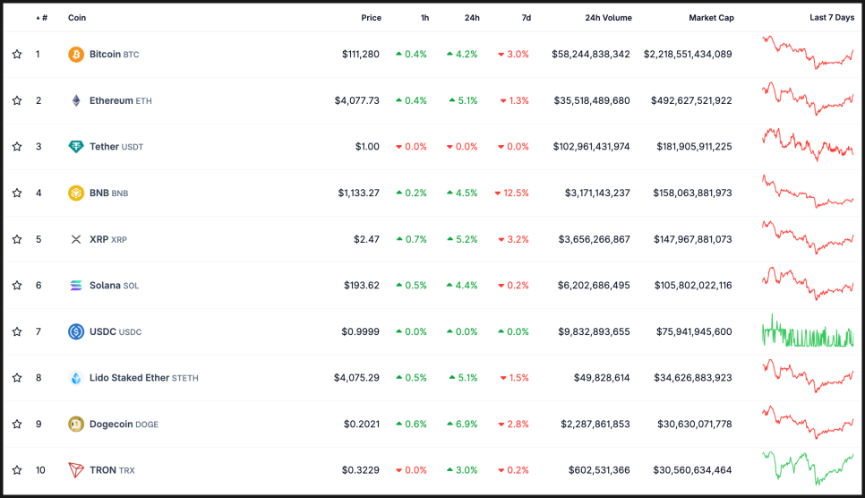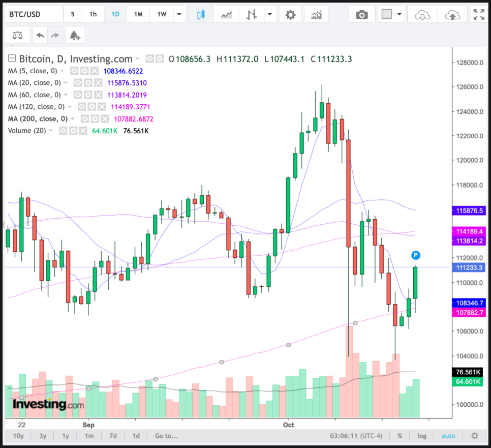 일봉 차트를 먼저 보겠습니다. 현재 비트코인 가격은 약 111,233달러로, 직전 저점(약 105,000달러 부근)에서 반등한 흐름을 보이고 있습니다. 캔들 패턴만 놓고 보면 최근 3거래일 동안 하락 흐름이 멈추고 매수세가 점차 유입되는 모습이 확연합니다. 거래량도 이전보다 눈에 띄게 늘어났는데요, 이는 단순한 ‘기술적 반등’ 이상의 의미를 가질 수 있는 신호로 해석됩니다.