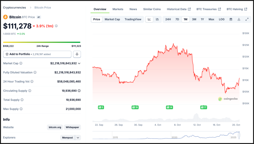 하지만 올해는 상황이 완전히 다릅니다. 2025년 10월 20일 기준 비트코인 가격은 약 11만 1천 달러 선으로, 월간 기준 약 4% 하락했습니다. 2015년 이후 가장 부진한 10월입니다. 매년 강세장을 이끌던 달이 올해는 오히려 하락한 달이 된 거죠.