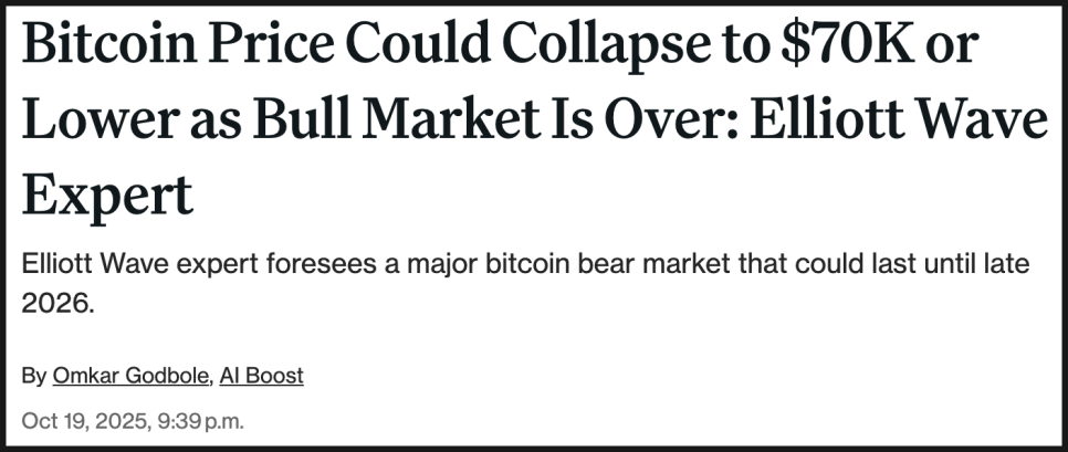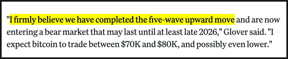 엘리엇 파동 이론 분석가인 존 글로버는 “비트코인은 이미 5파 상승 사이클을 마쳤고, 지금부터는 본격적인 하락장에 진입할 것”이라고 단언했습니다. 그는 비트코인이 2026년 말까지 7만~8만 달러 수준, 혹은 그 이하로 떨어질 수 있다고 예측했습니다.