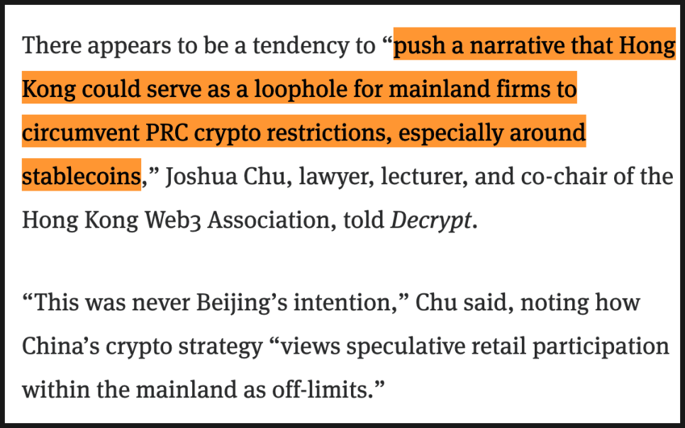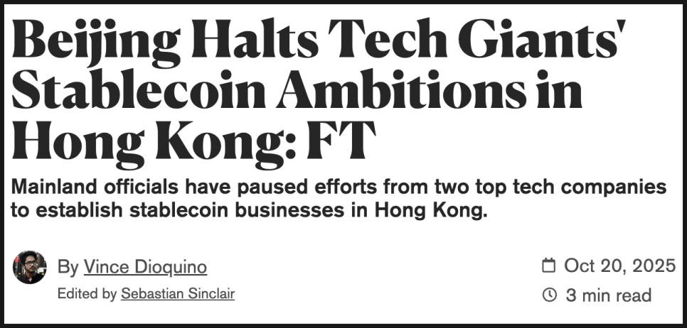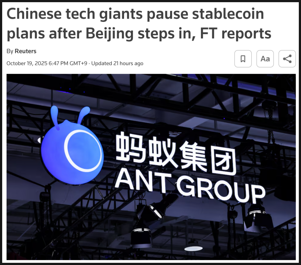 이번 주 시장에서 주목할 또 하나의 흐름은 중국의 규제 강화 움직임입니다. 베이징 당국이 앤트그룹과 JD닷컴 두 기업에 홍콩에서 추진하던 스테이블코인 사업을 중단하라고 지시했다는 소식이 전해졌습니다.