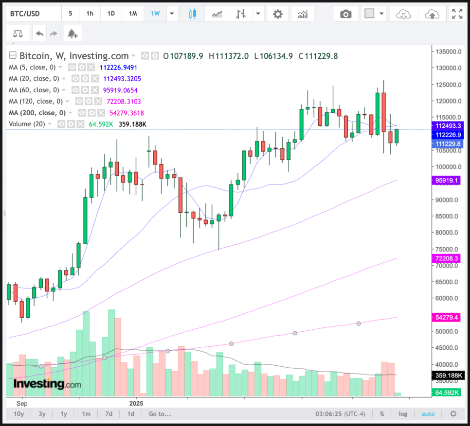 주간 차트를 보면, 가격은 여전히 장기 상승 추세 안에 위치해 있습니다. 현재 주간 종가는 약 111,229달러로, 5주 이동평균선(112,226달러)과 거의 맞닿아 있으며 20주 이동평균선(112,493달러) 아래에 근소한 차이로 머무르고 있습니다. 단기적으로는 주봉에서 반등의 시도가 이루어지고 있으나, 여전히 확실한 추세 전환 신호라 보기는 이릅니다.