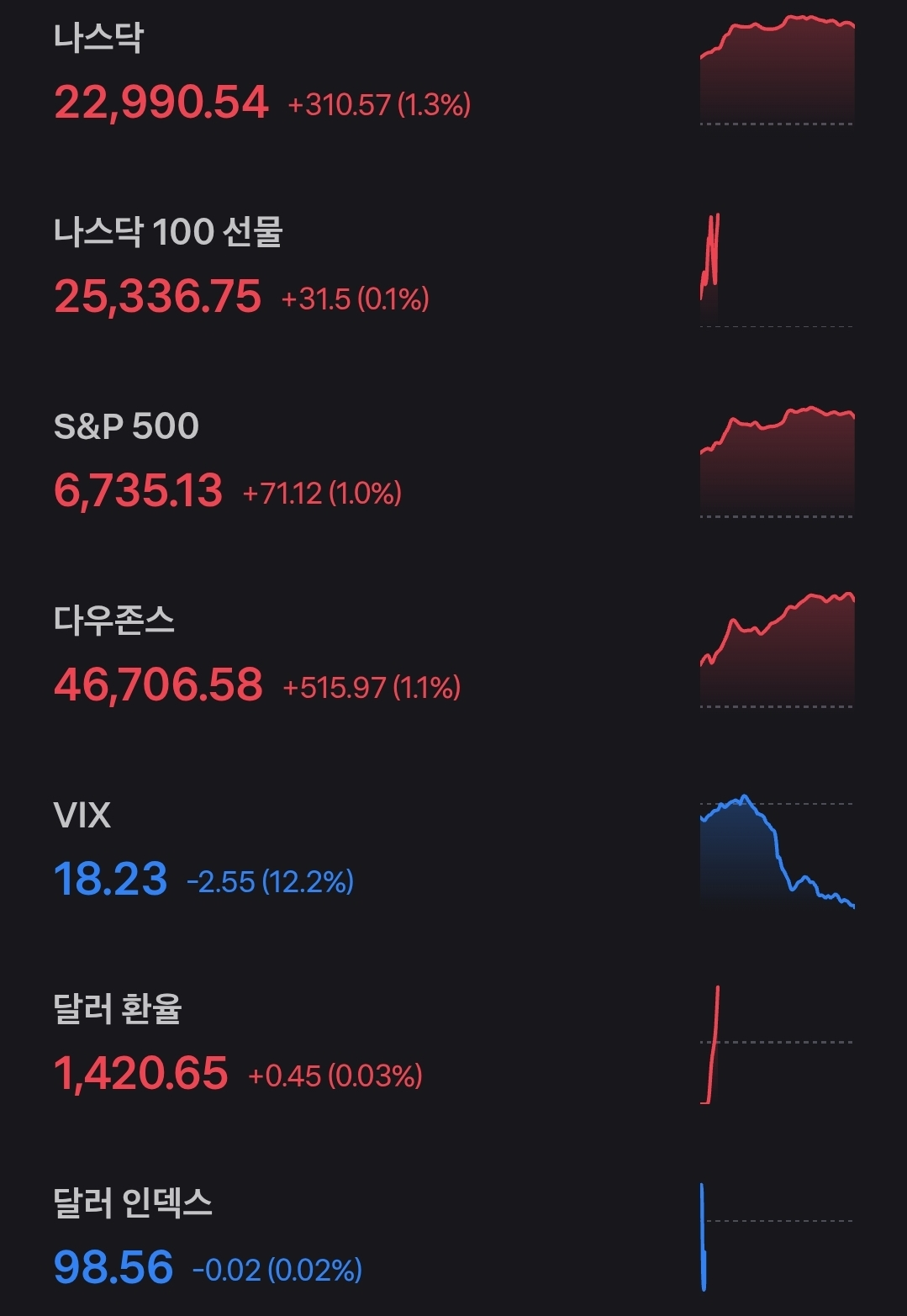 나스닥이 1.3%, S&P500이 1% 상승하며 주요 지수가 일제히 반등했습니다. 변동성 지수(VIX)는 18.23으로 12% 이상 급락했고 달러 인덱스는 98.5선을 유지했습니다. 시장 전반의 투자심리가 단기적으로 안정된 모습이지만 CNN 공포·탐욕지수가 여전히 ‘공포(30)’ 구간에 머물러 있어 투자자들의 신중함이 엿보입니다.