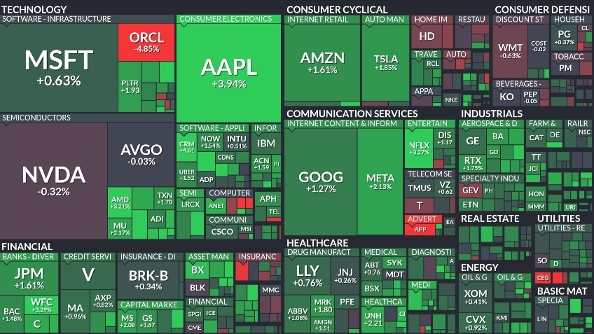 기술주 중심의 강세가 뚜렷했는데요, 애플(+3.9%)과 아마존(+1.6%)이 시장을 주도했고 엔비디아(-0.3%)는 소폭 약세를 보였습니다. 금융주는 안정적이었으며 헬스케어와 에너지 섹터도 소폭 상승했습니다. 최근 시장은 금리 하락과 함께 밸류에이션 부담이 완화되며 기술주 중심으로 재편되는 흐름을 보이고 있습니다.