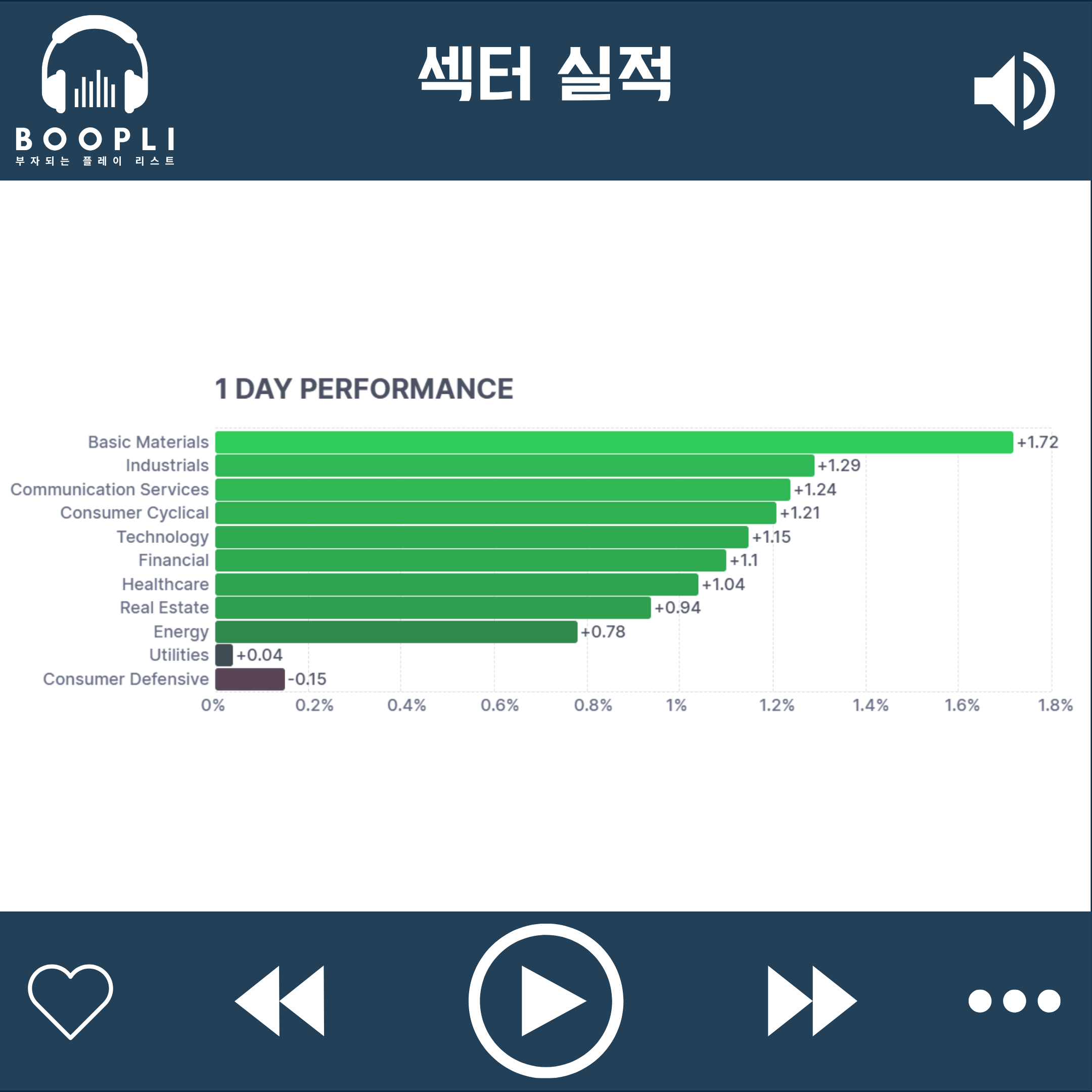 원자재 섹터가 상승을 주도했으며, 이어서 산업재, 커뮤니케이션 서비스, 소비 순환재, 기술, 금융, 헬스케어, 부동산, 에너지 순으로 강세