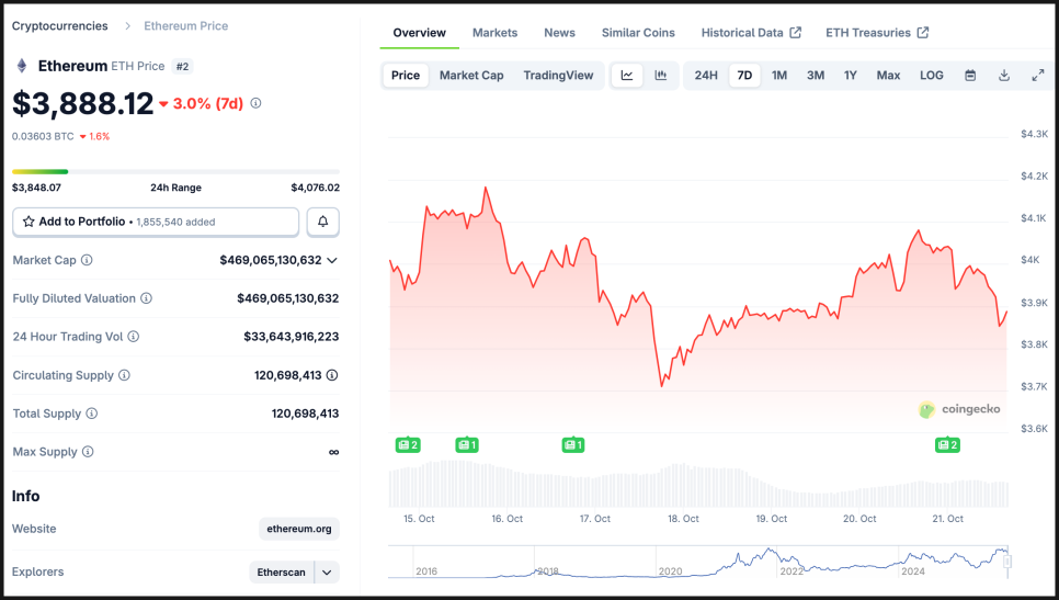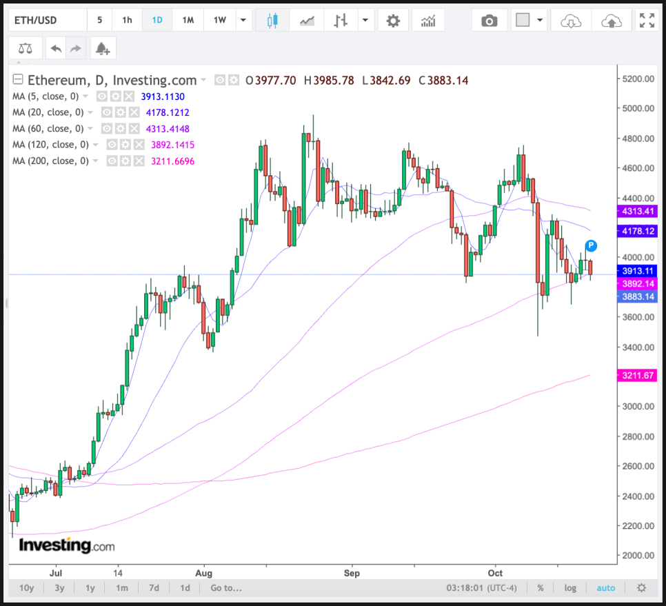 9월 중순 이후 이더리움 가격은 4,800달러 부근에서 강하게 눌리며 조정을 받았고, 10월 중순에도 4,000달러선을 회복하지 못한 채 단기 저항선에 막혀 있습니다. 특히 20일 이동평균선이 강한 저항선으로 작용하고 있어, 이 구간을 확실히 돌파하지 못하면 기술적 반등도 제한적일 가능성이 높습니다.