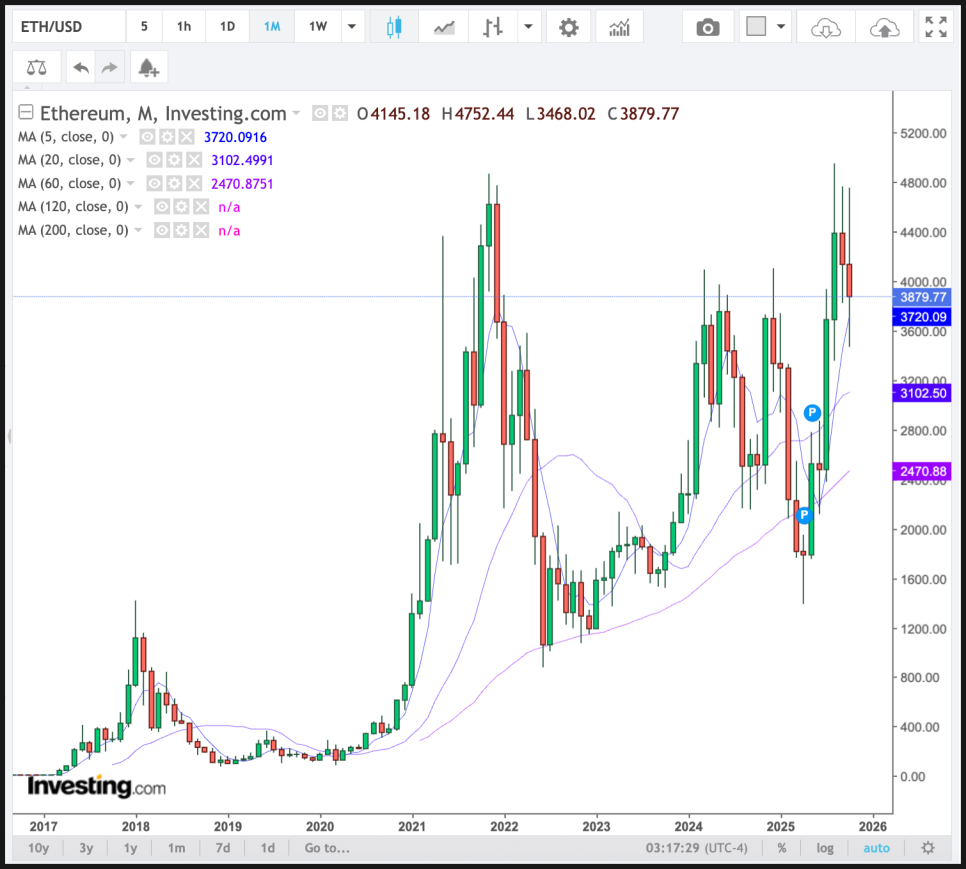 월봉 차트에서는 좀 더 거시적인 흐름이 보입니다. 5개월선은 3,720달러, 20개월선은 3,102달러, 60개월선은 2,470달러 부근에 자리하고 있습니다. 현재 가격은 5개월선 바로 아래에서 움직이고 있어, 단기적으로는 조정 국면이지만 중장기 지지선이 여전히 유효하다는 점이 확인됩니다.