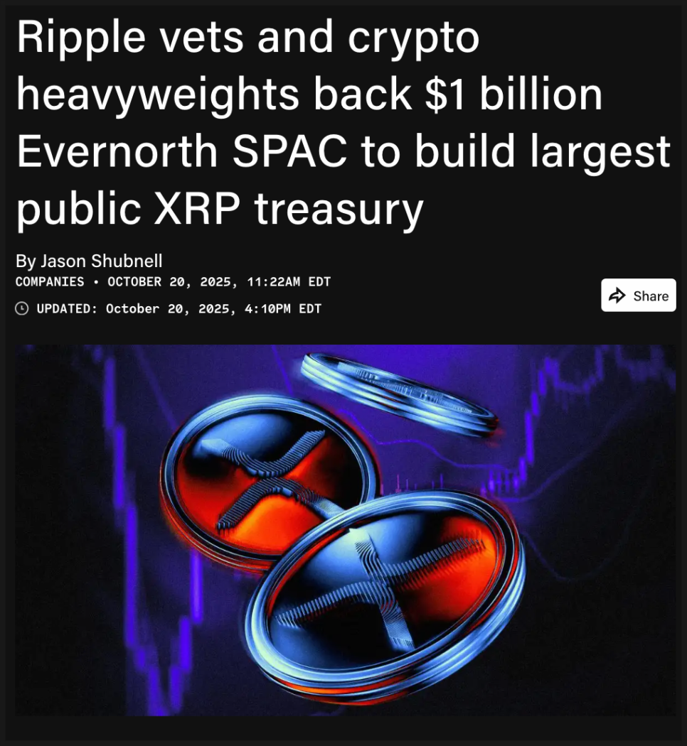 이번 주에는 리플(XRP) 관련 대형 뉴스도 있었습니다. 신설 기업 에버노스 홀딩스(Evernorth Holdings Inc.)가 기업인수목적회사 스팩(SPAC·Special-Purpose Acquisition Company)인 아르마다 애퀴지션(Armada Acquisition Corp II)과 합병해 미국 나스닥(Nasdaq)에 상장한다고 발표했습니다. 상장 완료는 2026년 1분기로 예상되며, 티커는 XRPN이 될 예정입니다.