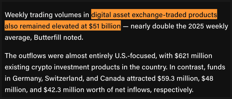 국가별로 보면 미국에서만 6억 2,100만 달러가 빠져나갔고, 독일(5,930만 달러), 스위스(4,800만 달러), 캐나다(4,230만 달러)에서는 오히려 자금이 유입됐습니다. 미국 투자자들이 방어적인 태도로 돌아선 반면, 해외에서는 여전히 선택적인 매수가 이뤄지고 있는 모습입니다.